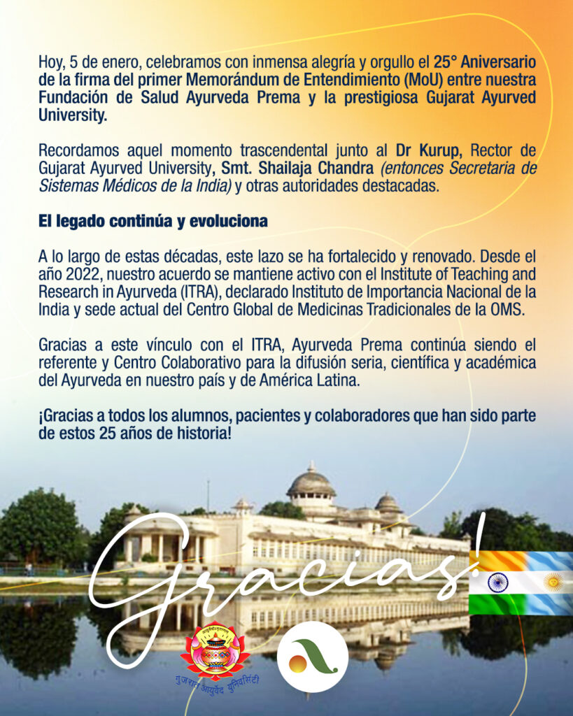 Hoy, 5 de enero, celebramos con inmensa alegría y orgullo el 25° Aniversario de la firma del primer Memorándum de Entendimiento (MoU) entre nuestra Fundación de Salud Ayurveda Prema y la prestigiosa Gujarat Ayurved University.