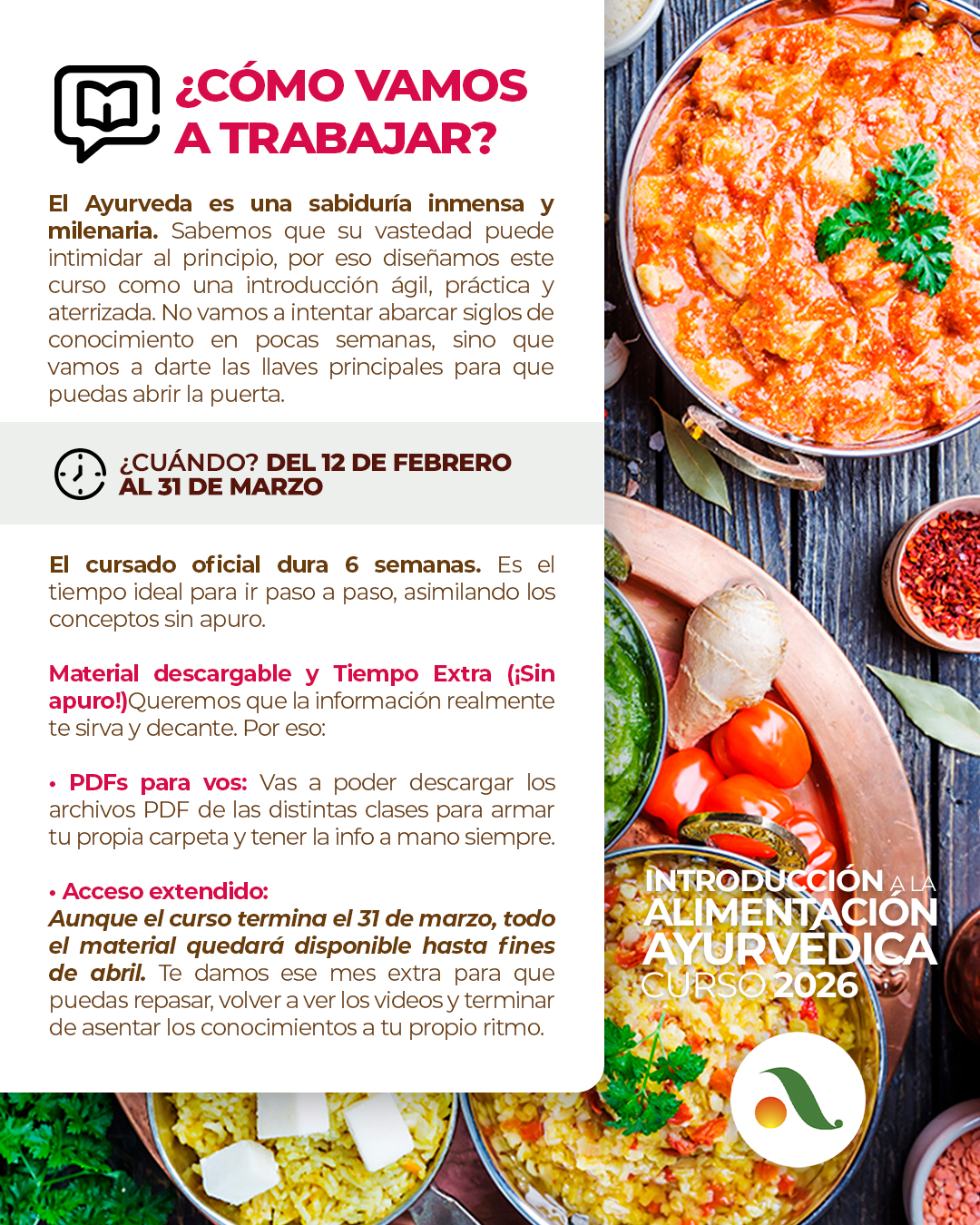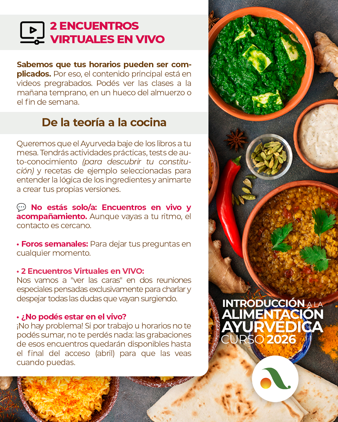 - Nutrición con sentido: Aprenderás las reglas de juego de la alimentación ayurvédica para aplicarlas en el día a día sin complicaciones.